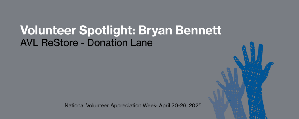 Living 20–30 minutes outside of Asheville, Bryan sought volunteer opportunities as a means of spending time outside of Canton, engaging with new people, and giving back to the community. Asheville Area Habitat for Humanity was fortunate enough to be the first nonprofit he signed up to volunteer with, and for the past 3+ years he’s been a constant presence in the Asheville ReStore’s donation lane on Tuesday afternoons. Having no prior experience with Habitat for Humanity, Bryan says, “I really couldn’t even tell you if there was a Habitat in New York City — Asheville Habitat was my first exposure to the work they do.”